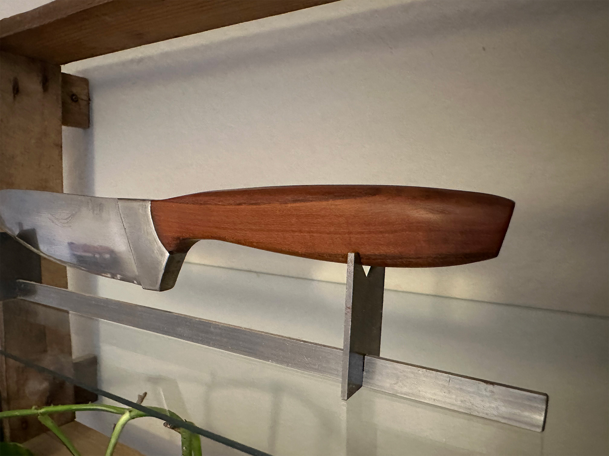 Der Messerstand, der aus einzelnen unbehandelten Stahlelementen zusammengesetzt wird, ist als einfaches Stecksystem entworfen. Das System gibt es in zwei verschiedenen Größen, sodass jede Art von Messer präsentiert werden kann.